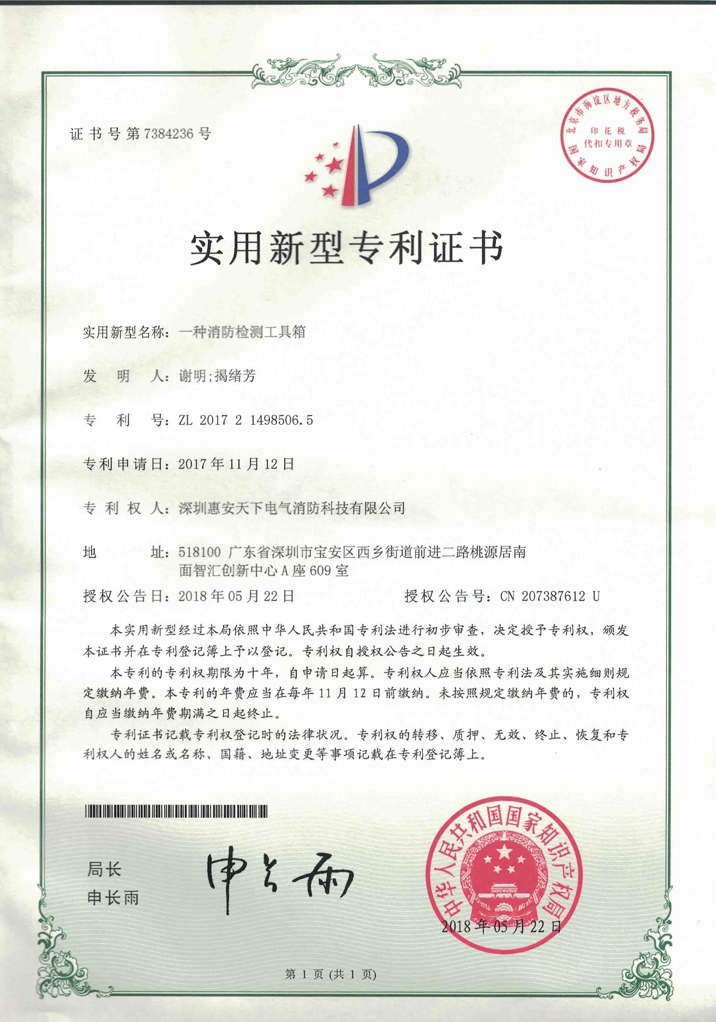 实用新型专利证书(一种消防检测工具箱)